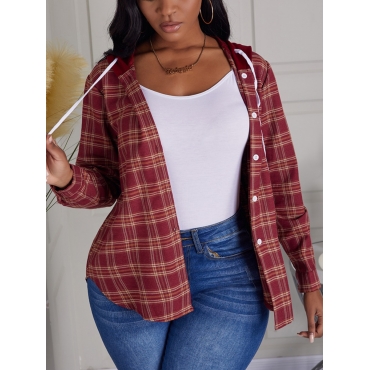 Lovely Casual Hooded Collar Plaid Print Red Coat