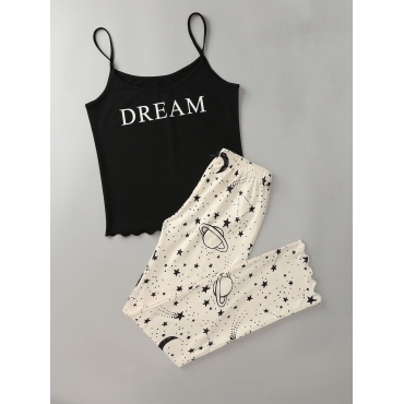 Lovely Casual Spaghetti Strap Letter Print Black Sleepwear