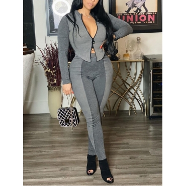 Lovely Chic Color-lump Zipper Design Grey Two Piece Pants Set