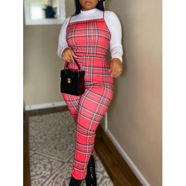 Lovely Sweet Half A Turtleneck Plaid Print Red Two Piece Pants Set