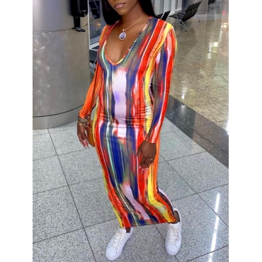 Lovely Casual V Neck Tie-dye Orange Ankle Length Dress(No-positioning Printing)