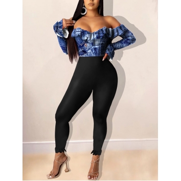 Lovely Chic Off The Shoulder Flounce Design Patchwork Blue One-piece Jumpsuit