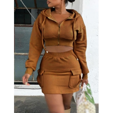 Lovely Casual Hooded Collar Zipper Design Coffee Two Piece Skirt Set