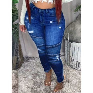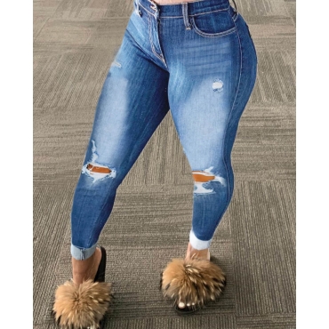 Lovely Casual High-waisted Broken Holes Baby Blue Jeans