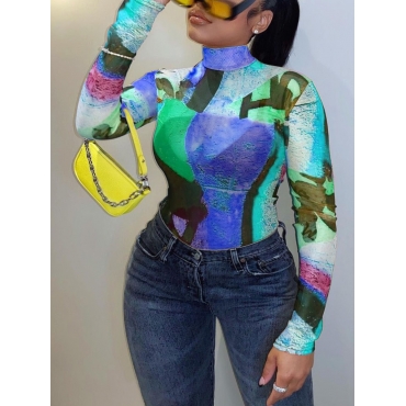 Lovely Street Turtleneck Color-lump Print Blue Plus Size T-shirt