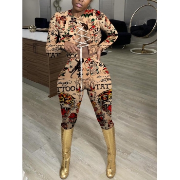 Lovely Stylish Letter Print Bandage Hollow-out Design Khaki Two Piece Pants Set