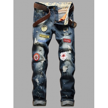 Lovely Street Letter Print Color-lump Patchwork Blue Men Jeans