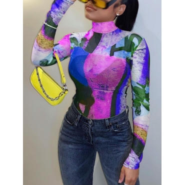 Lovely Street Turtleneck Color-lump Print Purple T-shirt