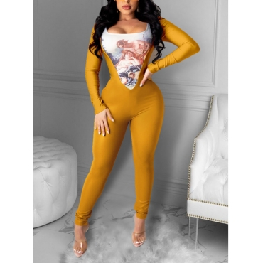 Lovely Sexy Print Patchwork Skinny Yellow One-piece Jumpsuit