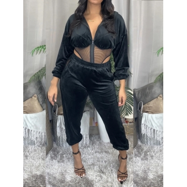 Lovely Sweet Mesh Patchwork Hollow-out Black Two Piece Pants Set