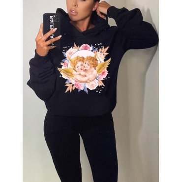 Lovely Casual Hooded Collar Doll Print Black Hoodie