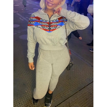 Lovely Street Leopard Print Patchwork Grey Two Piece Pants Set