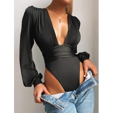 Lovely Sexy Deep V Neck Fold Design Black Bodysuit