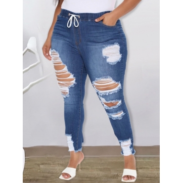 Lovely Casual High-waisted Broken Holes Blue Plus Size Jeans