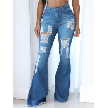 Lovely Casual Flared Broken Holes Deep Blue Jeans