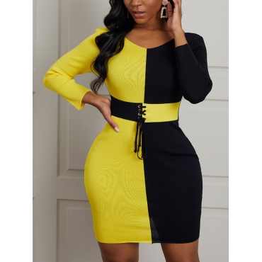 Lovely Casual O Neck Color-lump Stitching Yellow Mid Calf Dress