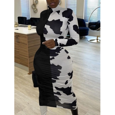 Lovely Casual Turtleneck Print Patchwork Black Mid Calf Dress