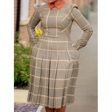 Lovely Formal Plaid Print Pleated Design Brown Mid Calf Plus Size Dress