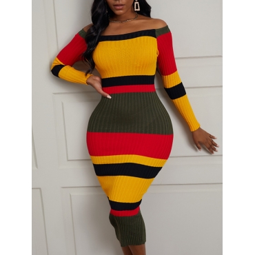 Lovely Casual Off The Shoulder Striped Yellow Mid Calf Dress