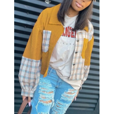 Lovely Casual Plaid Print Patchwork Yellow Coat