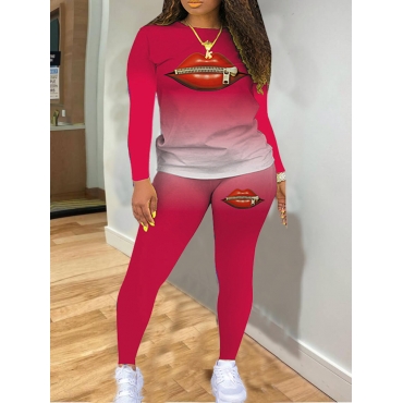 Lovely Casual Gradient Lip Print Rose Red Two Piece Pants Set