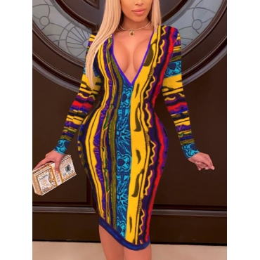 Lovely Casual V Neck Print Patchwork Yellow Knee Length Dress