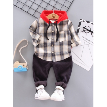 Lovely Street Hooded Collar Plaid Print Beige Boy Two Piece Pants Set