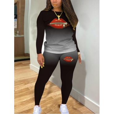 Lovely Casual Gradient Lip Print Pitch-black Two Piece Pants Set