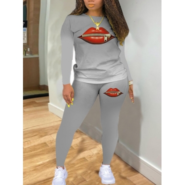 Lovely Casual Gradient Lip Print Grey Two Piece Pants Set