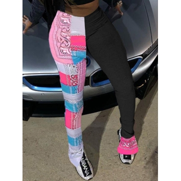 Lovely Street Print Patchwork Side Slit Blue Pants