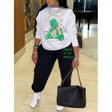 Lovely Street O Neck Print White Plus Size Two Piece Pants Set