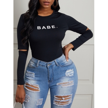 Lovely Casual O Neck Letter Letter Print Hollow-out Black T-shirt