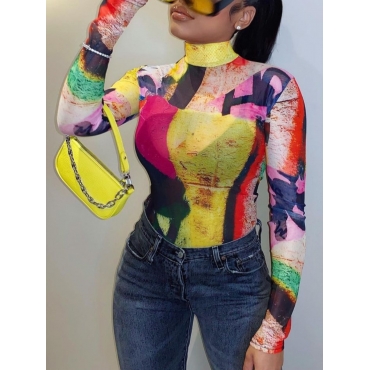 Lovely Street Turtleneck Color-Block Print Multicolor T-shirt