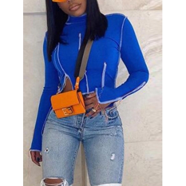 Lovely Casual Turtleneck Zipper Design Blue T-shirt