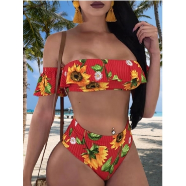 Lovely Sexy Floral Print Flap Over Red Two-piece Swimsuit