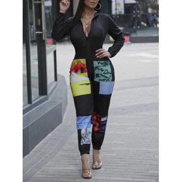 Lovely Stylish Turndown Collar Long Sleeve Print Patchwork Black One-piece Jumpsuit