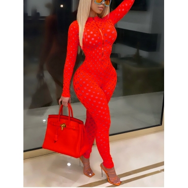 Lovely Sexy Mandarin Collar Hollow-out Red One-piece Jumpsuit