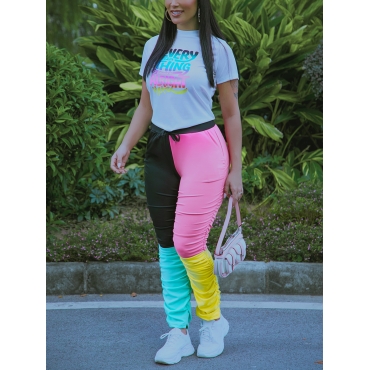 Lovely Sportswear O Neck Color-lump Patchwork Multicolor Two Piece Pants Set