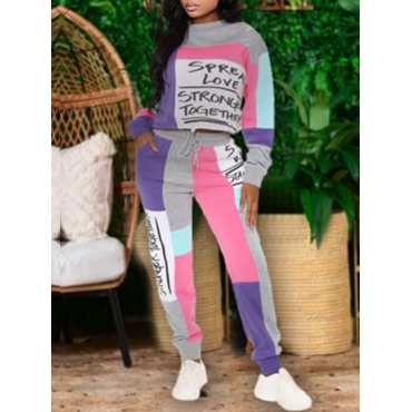 Lovely Sportswear O Neck Color-lump Patchwork Letter Print Purple Two Piece Pants Set