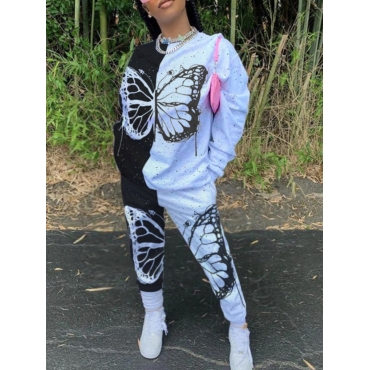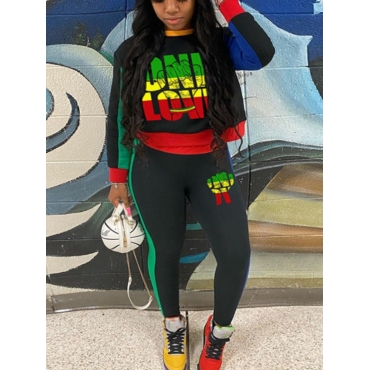 Lovely Casual O Neck Patchwork Print Black Two-piece Pants Set