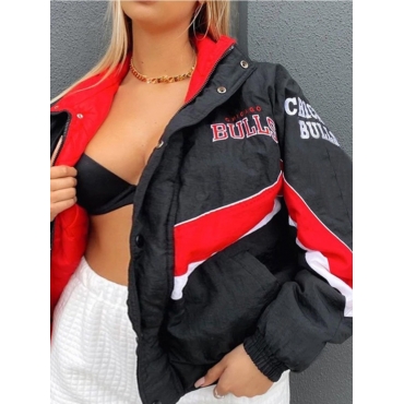 Lovely Casual Letter Print Color-lump Patchwork Black Plus Size Jacket
