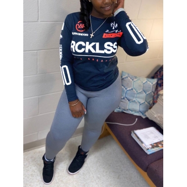 Lovely Sportswear O Neck Letter Print Deep Blue Two Piece Pants Set