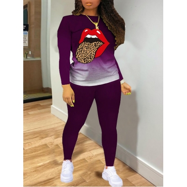 Lovely Casual Gradient Lip Print Purple Two Piece Pants Set