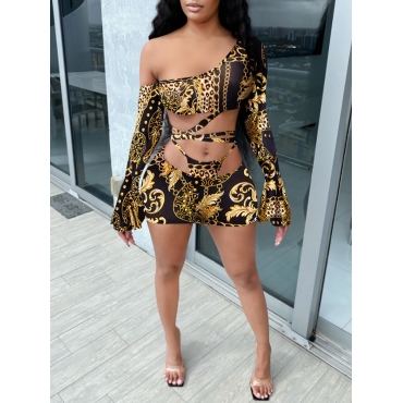 Lovely Sexy One Shoulder Bandage Design Leopard Print Two Piece Skirt Set