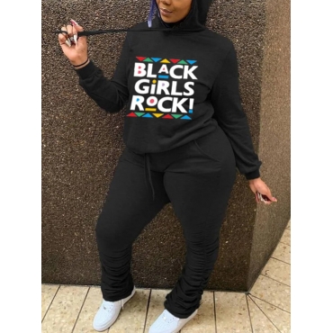 Lovely Casual Hooded Collar Letter Print Black Plus Size Two-piece Pants Set