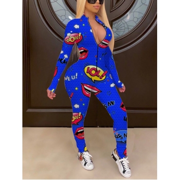 Lovely Casual Mandarin Collar Print Blue One-piece Jumpsuit