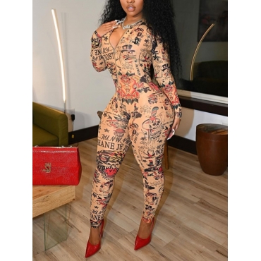 Lovely Street Zipper Letter Print Patchwork Khaki One-piece Jumpsuit(No-positioning Printing)