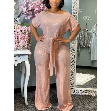 Lovely Party Bateau Neck Short Sleeve Sequined Pink Plus Size One-piece Jumpsuit