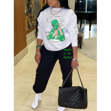 Lovely Street Masked Face Print Patchwork White Two Piece Pants Set