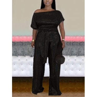Lovely Party Bateau Neck Short Sleeve Sequined Black Plus Size One-piece Jumpsuit